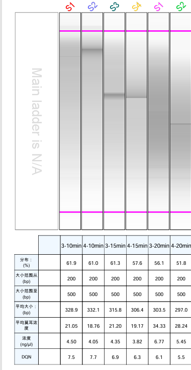 從上圖可看出:10分鐘的效果最佳,大部分在300-500 bp之間